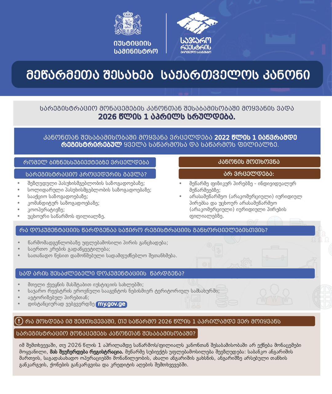 შეგახსენებთ, რომ სარეგისტრაციო მონაცემების მეწარმეთა შესახებ საქართველოს კანონთან შესაბამისობაში მოყვანის ვადა სრულდება 2026 წლის 1 აპრილს.